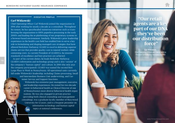 As part of his current duties , he leads Berkshire Hathaway GUARD ’ s information and technology group and is also “ curator ” of the company ’ s “ human capital ” and culture . In 2001 ( the only year the company participated ), GUARD was named the second Best Large Place to Work in Pennsylvania . All operational units currently fall under Witkowski ’ s leadership , including Claims processing , Small and Intermediate Business Unit underwriting , and Customer Service and Support functions .