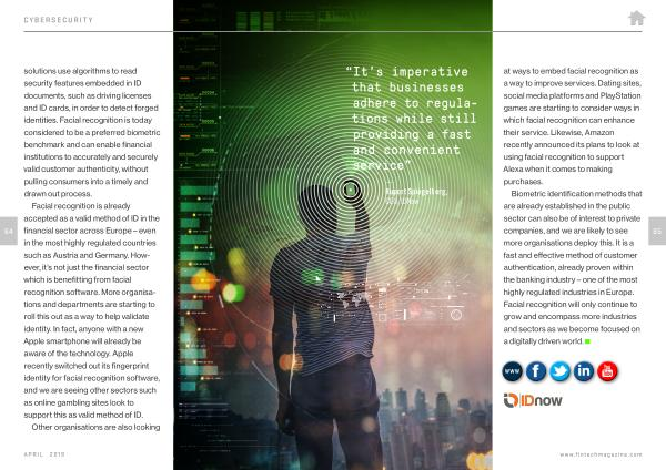 Biometric identification methods that are already established in the public sector can also be of interest to private companies , and we are likely to see more organisations deploy this . It is a fast and effective method of customer authentication , already proven within the banking industry – one of the most highly regulated industries in Europe . Facial recognition will only continue to grow and encompass more industries and sectors as we become focused on a digitally driven world .
