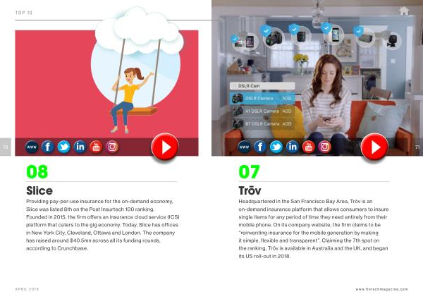 Providing pay-per-use insurance for the on-demand economy , Slice was listed 8th on the Post Insurtech 100 ranking . Founded in 2015 , the firm offers an insurance cloud service ( ICS ) platform that caters to the gig economy . Today , Slice has offices in New York City , Cleveland , Ottawa and London . The company has raised around $ 40.5mn across all its funding rounds , according to Crunchbase .