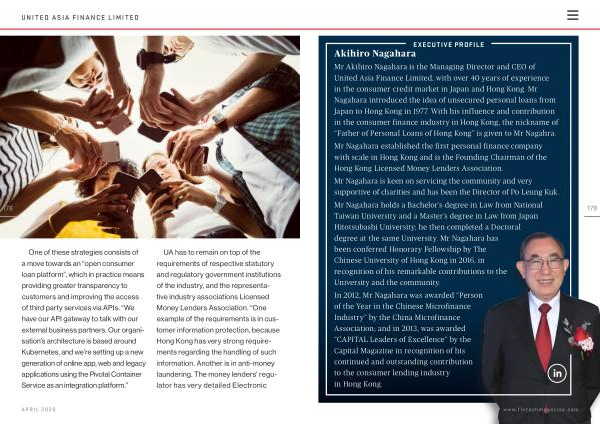Mr Akihiro Nagahara is the Managing Director and CEO of United Asia Finance Limited , with over 40 years of experience in the consumer credit market in Japan and Hong Kong . Mr Nagahara introduced the idea of unsecured personal loans from Japan to Hong Kong in 1977 . With his influence and contribution in the consumer finance industry in Hong Kong , the nickname of “ Father of Personal Loans of Hong Kong ” is given to Mr Nagahra . Mr Nagahara established the first personal finance company with scale in Hong Kong and is the Founding Chairman of the Hong Kong Licensed Money Lenders Association . Mr Nagahara is keen on servicing the community and very supportive of charities and has been the Director of Po Leung Kuk . Mr Nagahara holds a Bachelor ’ s degree in Law from National Taiwan University and a Master ’ s degree in Law from Japan Hitotsubashi University ; he then completed a Doctoral degree at the same University . Mr Nagahara has been conferred Honorary Fellowship by The Chinese University of Hong Kong in 2016 , in recognition of his remarkable contributions to the University and the community .