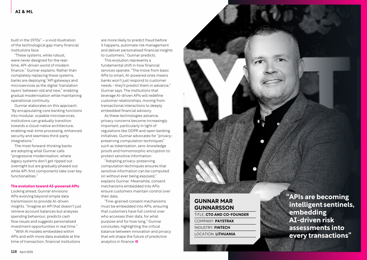 The evolution toward AI-powered APIs Looking ahead, Gunnar envisions APIs evolving beyond simple data transmission to provide AI-driven insights.“ Imagine an API that doesn’ t just retrieve account balances but analyses spending behaviour, predicts cash flow issues and suggests personalised investment opportunities in real time.”“ With AI models embedded within APIs and with more data available at the time of transaction, financial institutions are more likely to predict fraud before it happens, automate risk management and deliver personalised financial insights to customers,” Gunnar predicts. This evolution represents a fundamental shift in how financial services operate.“ The move from basic APIs to smart, AI-powered ones means banks won’ t just respond to customer needs- they’ ll predict them in advance,” Gunnar says. The institutions that leverage AI-driven APIs will redefine customer relationships, moving from transactional interactions to deeply embedded financial advisory.