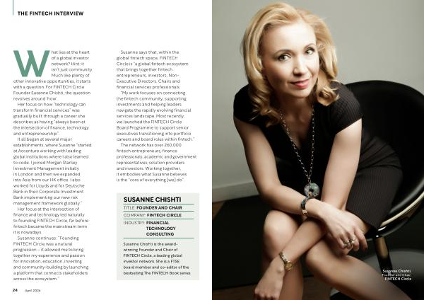 Susanne continues:“ Founding FINTECH Circle was a natural progression – it allowed me to bring together my experience and passion for innovation, education, investing and community-building by launching a platform that connects stakeholders across the ecosystem.”