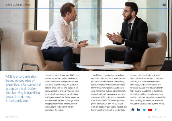 “ ANB is an organisation based on decades of expertise , a fundamental grasp on the direction that banking is travelling towards and most importantly trust ” premier project financiers , ANB possesses an innate understanding of the local market , its regulations and available opportunities . As such , it is able to offer end-to-end support on every aspect of project finance , from arranging loans to debt syndication and agency services . Other services include credit products , bridge loans , hedging facilities and more , all with the capacity to be fully Shariahcompliant if needed .