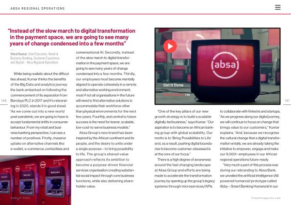 There is a high degree of awareness around the fast changing landscape at Absa Group and efforts are being made to accelerate the transformation journey by opening up the group ’ s legacy systems through microservices / APIs to collaborate with fintechs and startups . “ As we progress along our digital journey , we will continue to focus on change that brings value to our customers ,” Kumar explains . “ And , because we recognise the cultural change that a digital transformation entails , we are already taking the initiative to empower , engage and make our 9,000 + employees in our African regional operations future-ready .