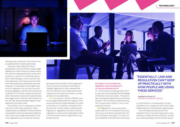 Q . Is there a ‘ war on talent ’ for regulation-savvy executives ? If so , how can fintechs win it ? BR : I think they ' re actually going to have to rely upon and leverage the knowledge of the best service providers . This area is fast-moving and requires time to think and analyse . The necessary understanding will not generally reside in one or two executive recruits .