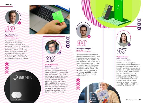 Twenty-four-year-old Brazilian entrepreneur Henrique Bubogras is certainly one to watch . Always brilliantly inventive , at 14 he got into legal hot water for hacking a video game and putting it online for free . He built his first fintech - the payment company Pagar . me aged 16 which is now Brazil ’ s version of Stripe . Today he is co-founder and CEO of Brex , the first of its kind corporate card for startups .