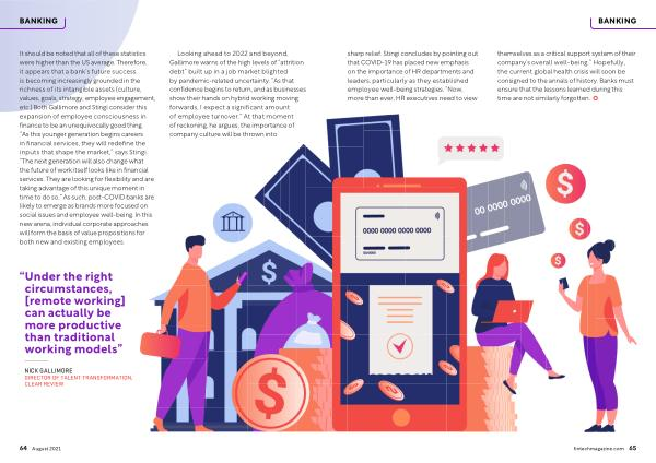 It should be noted that all of these statistics were higher than the US average . Therefore , it appears that a bank ’ s future success is becoming increasingly grounded in the richness of its intangible assets ( culture , values , goals , strategy , employee engagement , etc .) Both Gallimore and Stingi consider this expansion of employee consciousness in finance to be an unequivocally good thing . “ As this younger generation begins careers in financial services , they will redefine the inputs that shape the market ,” says Stingi . “ The next generation will also change what the future of work itself looks like in financial services . They are looking for flexibility and are taking advantage of this unique moment in time to do so .” As such , post-COVID banks are likely to emerge as brands more focused on social issues and employee well-being . In this new arena , individual corporate approaches will form the basis of value propositions for both new and existing employees .