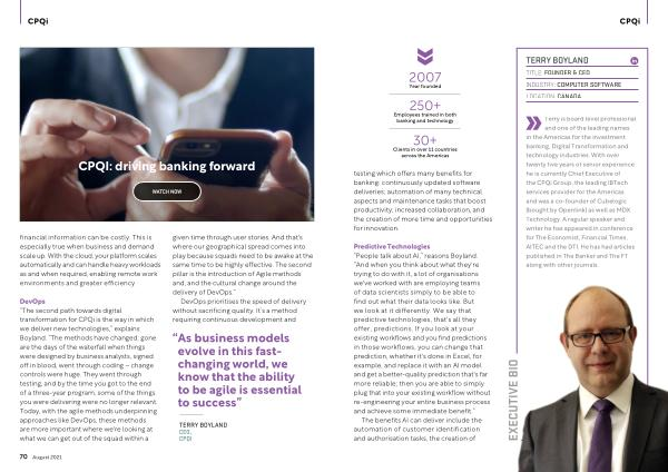 Terry is board level professional and one of the leading names in the Americas for the investment banking , Digital Transformation and technology industries . With over twenty five years of senior experience he is currently Chief Executive of the CPQi Group , the leading IBTech services provider for the Americas and was a co-founder of Cubelogic ( bought by Openlink ) as well as MDX Technology . A regular speaker and writer he has appeared in conference for The Economist , Financial Times , AITEC and the DTI . He has had articles published in The Banker and The FT along with other journals .