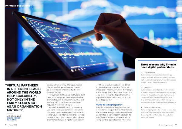 “ There is no turning back – and that includes banking providers . Financial institutions will only survive if they adopt this strategy . And if they need speed , the only route forward is to partner with a digital provider to adopt this platformbased approach .”