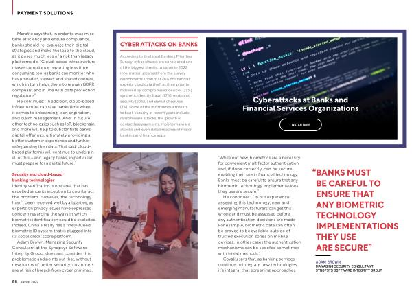 Banking Priorities Survey , cyber attacks are considered one of the biggest threats to banks in 2022 . Information gleaned from the survey respondents show that 24 % of financial experts cited data theft as their priority , followed by compromised devices ( 21 %), synthetic identity fraud ( 17 %), endpoint security ( 10 %), and denial of service ( 7 %). Some of the most serious threats to bank security in recent years include ransomware attacks , the growth of contactless payments , mobile malware attacks and even data breaches of major banking and finance apps .