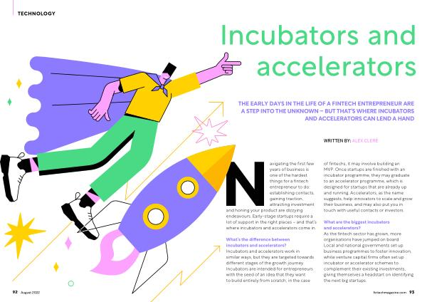 What ’ s the difference between incubators and accelerators ? Incubators and accelerators work in similar ways , but they are targeted towards different stages of the growth journey . Incubators are intended for entrepreneurs with the seed of an idea that they want to build entirely from scratch ; in the case of fintechs , it may involve building an MVP . Once startups are finished with an incubator programme , they may graduate to an accelerator programme , which is designed for startups that are already up and running . Accelerators , as the name suggests , help innovators to scale and grow their business , and may also put you in touch with useful contacts or investors .