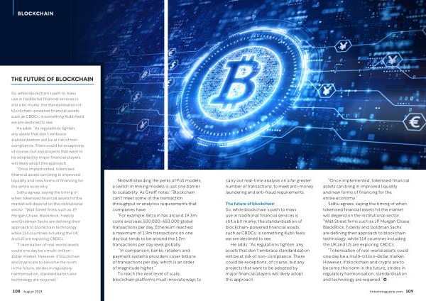 The future of blockchain So , while blockchain ’ s path to mass use in traditional financial services is still a bit murky , the standardisation of blockchain-powered financial assets , such as CBDCs , is something Kubli feels we are destined to see .