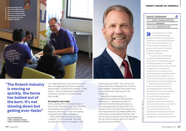 DAVID GERMANN CHIEF LENDING OFFICER , CREDIT UNION OF AMERICA in a “ regimented way ” was not for him , and after investigating credit unions , saw “ the planets align ” in a field of his interest – credit unions – with an opening at Credit Union of America . He says he “ couldn ’ t apply fast enough .”