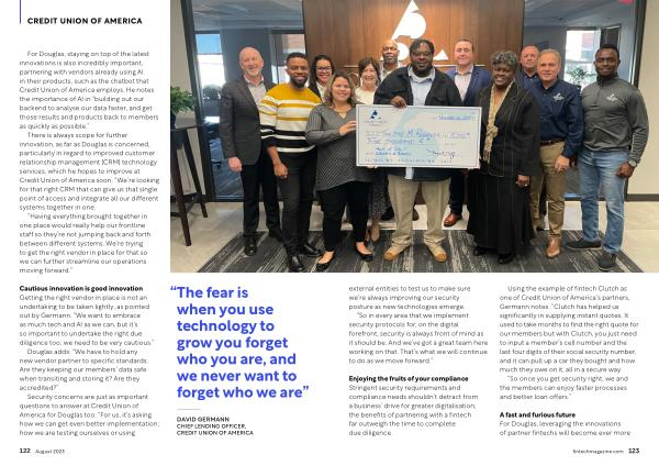 Using the example of fintech Clutch as one of Credit Union of America ’ s partners , Germann notes : “ Clutch has helped us significantly in supplying instant quotes . It used to take months to find the right quote for our members but with Clutch , you just need to input a member ’ s cell number and the last four digits of their social security number , and it can pull up a car they bought and how much they owe on it , all in a secure way .
