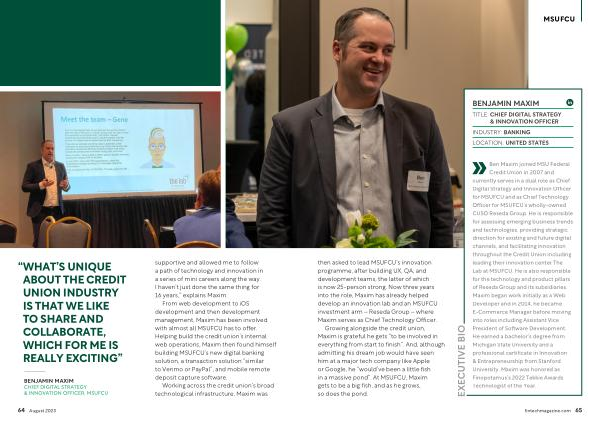 BENJAMIN MAXIM CHIEF DIGITAL STRATEGY & INNOVATION OFFICER , MSUFCU supportive and allowed me to follow a path of technology and innovation in a series of mini careers along the way . I haven ’ t just done the same thing for 16 years ,” explains Maxim .
