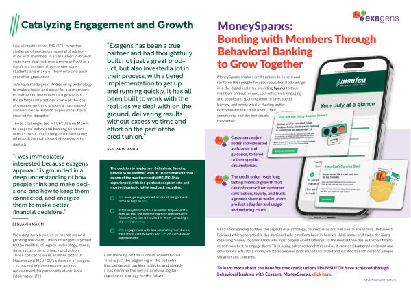 Those challenges led MSUFCU ’ s Ben Maxim to exagens ’ behavioral banking solutions with its focus on building and maintaining relationships and a bond of community , digitally .