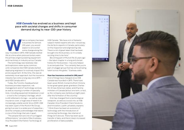 HSB Canada . “ We have a lot of fantastic subject matter experts who are , I would say , the de facto experts in Canada , particularly on the inspection and engineering side . There ’ s a lot of great talent that has been brought into the business , so it ’ s a really exciting time to be here .”