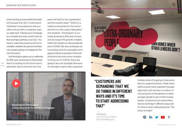 — Vicki Harris , Chief Commercial Officer , Kensington Mortgages holiday where it ’ s going to take more time to underwrite them . I think there will be a much more customer-focused approach and we have a number of new products in the pipeline to allow younger people to get on the housing ladder . Customers are demanding that we do things in different ways and it ’ s time to start addressing that . The future is bright .” fintechmagazine . com