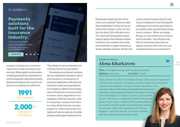 Alena Kharkavets is the VP of Digital Strategy and Customer Experience at BrokerLink Insurance . She brings extensive experience in actuarial , corporate development , strategy and sales operations . She ’ s passionate about modernizing and simplifying the insurance experience . Alena graduated from the University of Toronto with a dual degree in Computer Science and Actuarial Science . She has also completed a Global Professional Master of Laws . She is a Fellow of the Canadian Institute of Actuaries and the Casualty Actuarial Society . Outside of insurance , Alena loves spending time with her daughters , ages two and four . She loves travelling with them and showing them the world . fintechmagazine . com