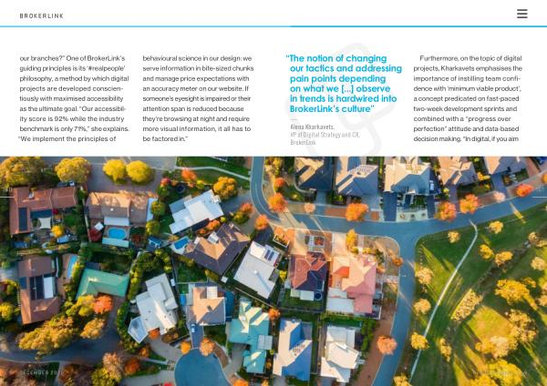 our branches ?” One of BrokerLink ’ s guiding principles is its ‘# realpeople ’ philosophy , a method by which digital projects are developed conscientiously with maximised accessibility as the ultimate goal . “ Our accessibility score is 92 % while the industry benchmark is only 71 %,” she explains . “ We implement the principles of behavioural science in our design : we serve information in bite-sized chunks and manage price expectations with an accuracy meter on our website . If someone ’ s eyesight is impaired or their attention span is reduced because they ’ re browsing at night and require more visual information , it all has to be factored in .”