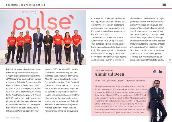 Takaful . “ However , despite that , there is still plenty of room for us to grow .” A highly experienced executive in the APAC insurance market , Deen earned a degree in Actuarial Science from the London School of Economics ( 1988 to 1991 ) prior to starting his insurance career in Dubai . From there , he moved to the Asia Pacific Region , with Allianz in 1997 , joining their Indonesian Life Company just a few weeks before the Asian Financial crisis hit the region . He completed a stint with Allianz in his native Pakistan spending four years as CEO of Allianz-EFU Health Insurance , before moving back to the Indonesian Market in early 2005 . After 13 years with Allianz , he joined Prudential Indonesia as Chief Financial Officer and finally took on his current role at PruBSN in 2014 , Deen says that he came to recognise both the challenges and significant potential of the Malaysian market , especially in the area of Islamic Insurance or Takaful . “ Malaysia is a fairly heavily regulated market , but I don ’ t mean that in a negative way . While we always have