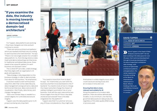Analytics and AI at GFT . He has been working in the data space for over 20 years , from technical development through to business development . His area of expertise is enterprise data strategy , with a focus on hybrid data architecture patterns and applications . His career experience includes working at the Bank for International Settlements in Basel , Athene Holding in Bermuda , and Milliman Actuarial Consultancy in London .