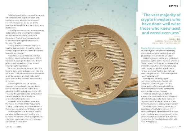 So , while crypto is set to be the digital asset class of the future , for now , it ’ s about striking the right balances to restore trust in a digital asset class currently in the doldrums of public opinion . But , fear not cryptonites , for this digital asset class will have its heyday . fintechmagazine . com 127