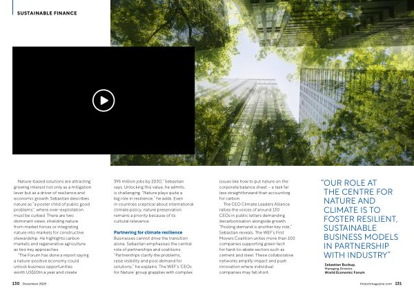 395 million jobs by 2030,” Sebastian says. Unlocking this value, he admits, is challenging.“ Nature plays quite a big role in resilience,” he adds. Even in countries sceptical about international climate policy, nature preservation remains a priority because of its cultural relevance.