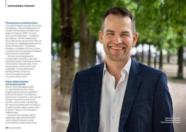 Nature-based solutions and business growth Nature, often underappreciated in corporate boardrooms, offers tangible opportunities for adaptation and business growth. For Sebastian, nature’ s role in resilience“ is just moving forward”. He points out that direct benefits, such as urban tree planting, are more immediately felt than abstract investments that reduce carbon in the long term.“ Nature is more tangible,” Sebastian says.