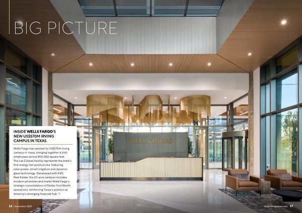 Wells Fargo has opened its US $ 570m Irving campus in Texas, bringing together 4,500 employees across 850,000 square feet. The Las Colinas facility represents the bank’ s first energy net-positive site, featuring solar power, smart irrigation and dynamic glass technology. Developed with KDC Real Estate, the 22-acre campus includes modern amenities and marks Wells Fargo’ s strategic consolidation of Dallas-Fort Worth operations, reinforcing Texas’ s position as America’ s emerging financial hub.