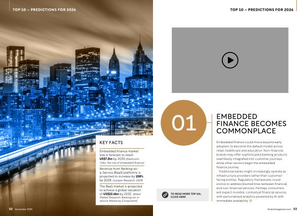 Traditional banks might increasingly operate as infrastructure providers rather than customerfacing entities. Regulatory frameworks could evolve to address blurred lines between financial and non-financial services. Perhaps consumers will expect invisible, contextual financial services with personalised analytics powered by AI with immediate availability. fintechmagazine. com 53