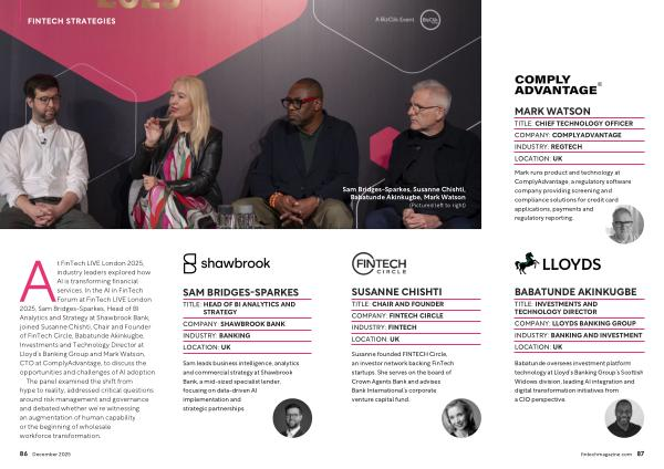 At FinTech LIVE London 2025, industry leaders explored how AI is transforming financial services. In the AI in FinTech Forum at FinTech LIVE London 2025, Sam Bridges-Sparkes, Head of BI Analytics and Strategy at Shawbrook Bank, joined Susanne Chishti, Chair and Founder of FinTech Circle, Babatunde Akinkugbe, Investments and Technology Director at Lloyd’ s Banking Group and Mark Watson, CTO at ComplyAdvantage, to discuss the opportunities and challenges of AI adoption.