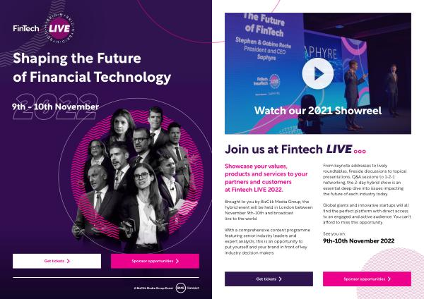 Showcase your values , products and services to your partners and customers at Fintech LIVE 2022 .