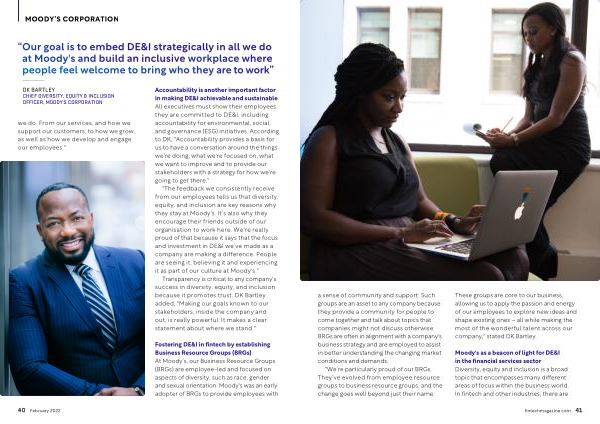 " The feedback we consistently receive from our employees tells us that diversity , equity , and inclusion are key reasons why they stay at Moody ' s . It ’ s also why they encourage their friends outside of our organisation to work here . We ' re really proud of that because it says that the focus and investment in DE & I we ’ ve made as a company are making a difference . People are seeing it , believing it and experiencing it as part of our culture at Moody ' s ."