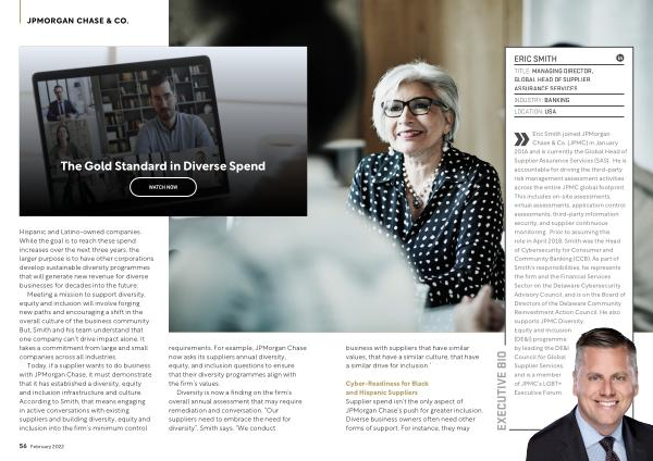 Chase & Co . ( JPMC ) in January 2016 and is currently the Global Head of Supplier Assurance Services ( SAS ). He is accountable for driving the third-party risk management assessment activities across the entire JPMC global footprint . This includes on-site assessments , virtual assessments , application control assessments , third-party information security , and supplier continuous monitoring . Prior to assuming this role in April 2018 , Smith was the Head of Cybersecurity for Consumer and Community Banking ( CCB ). As part of Smith ' s responsibilities , he represents the firm and the Financial Services Sector on the Delaware Cybersecurity Advisory Council , and is on the Board of Directors of the Delaware Community Reinvestment Action Council . He also supports JPMC Diversity , Equity and Inclusion ( DE & I ) programme by leading the DE & I Council for Global Supplier Services , and is a member of JPMC ’ s LGBT + Executive Forum .
