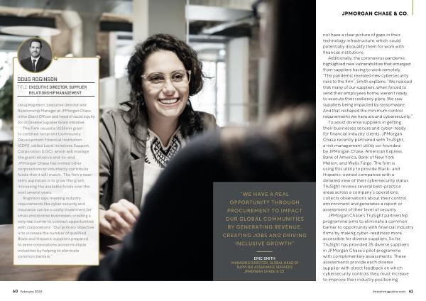 To assist diverse suppliers in getting their businesses secure and cyber-ready for financial industry clients , JPMorgan Chase recently partnered with TruSight , a risk management utility co-founded by JPMorgan Chase , American Express , Bank of America , Bank of New York Mellon , and Wells Fargo . The firm is using this utility to provide Black- and Hispanic-owned companies with a detailed view of their cybersecurity status . TruSight reviews several best-practice areas across a company ’ s operations , collects observations about their control environment and generates a report or assessment of their level of security .