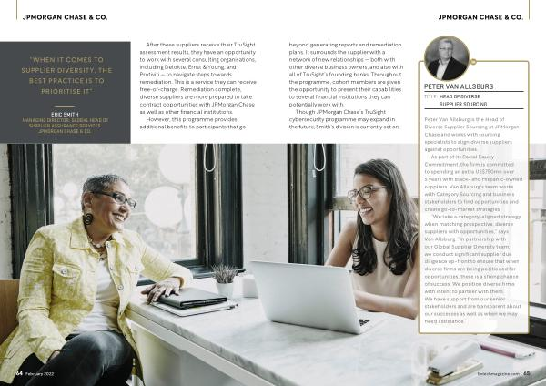 JPMORGAN CHASE & CO . beyond generating reports and remediation plans . It surrounds the supplier with a network of new relationships — both with other diverse business owners , and also with all of TruSight ’ s founding banks . Throughout the programme , cohort members are given the opportunity to present their capabilities to several financial institutions they can potentially work with .