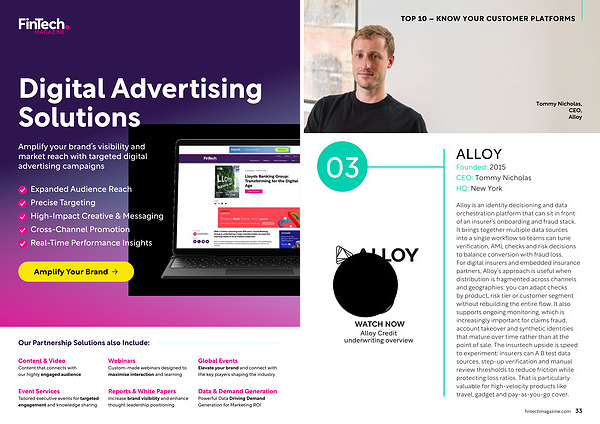 Alloy is an identity decisioning and data orchestration platform that can sit in front of an insurer’ s onboarding and fraud stack. It brings together multiple data sources into a single workflow so teams can tune verification, AML checks and risk decisions to balance conversion with fraud loss. For digital insurers and embedded insurance partners, Alloy’ s approach is useful when distribution is fragmented across channels and geographies: you can adapt checks by product, risk tier or customer segment without rebuilding the entire flow. It also supports ongoing monitoring, which is increasingly important for claims fraud, account takeover and synthetic identities that mature over time rather than at the point of sale. The insurtech upside is speed to experiment: insurers can A B test data sources, step-up verification and manual review thresholds to reduce friction while protecting loss ratios. That is particularly valuable for high-velocity products like travel, gadget and pay-as-you-go cover.