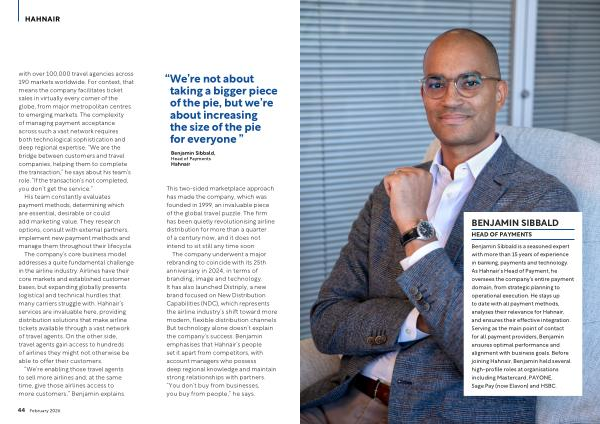 Benjamin Sibbald is a seasoned expert with more than 15 years of experience in banking, payments and technology. As Hahnair’ s Head of Payment, he oversees the company’ s entire payment domain, from strategic planning to operational execution. He stays up to date with all payment methods, analyses their relevance for Hahnair, and ensures their effective integration. Serving as the main point of contact for all payment providers, Benjamin ensures optimal performance and alignment with business goals. Before joining Hahnair, Benjamin held several high-profile roles at organisations including Mastercard, PAYONE, Sage Pay( now Elavon) and HSBC.