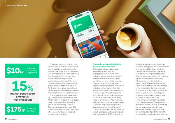 first physical payment card and gain access to Visa’ s global merchant network of more than 150 million locations. The partnership involved migrating Zilch’ s transaction processing onto Visa’ s infrastructure, which the company reports has improved processing efficiency and capital utilisation. Mandy Lamb, Managing Director for UK and Ireland at Visa, said at the time of the physical card announcement:“ It’ s fantastic to welcome Zilch into the Visa ecosystem as we work together to deliver world-class products and solutions to help them scale.”