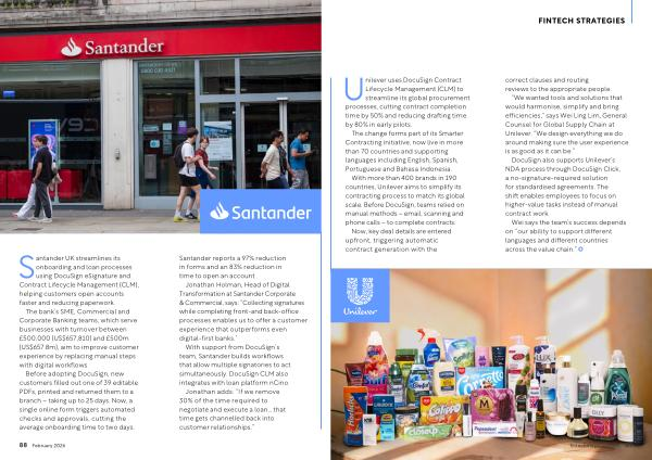 Unilever uses DocuSign Contract Lifecycle Management( CLM) to streamline its global procurement processes, cutting contract completion time by 50 % and reducing drafting time by 80 % in early pilots.