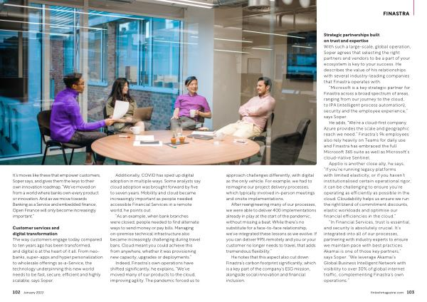 “ Microsoft is a key strategic partner for Finastra across a broad spectrum of areas , ranging from our journey to the cloud , to IPA ( intelligent process automation ), security and the employee experience ,” says Soper .