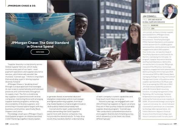 Jim Connell , as Head of Global Supplier Services ( GSS ) for JPMorgan Chase & Co ., is responsible for Sourcing , Procurement , Third Party Oversight ( TPO ), Payment Operations and supplier control assessment for a $ 19B supplier spend portfolio , distributed across 31,000 engagements with 6,500 suppliers . Prior to this role , Jim was the Head of Third Party Operations and Controls for the firm , overseeing the firm wide TO program , Supplier Assurance Services and Payment Operations . Before this , Jim led the firm ' s Corporate TPO group , inclusiveof the PO policy , technology , regulatory engagement and cybersecurity . Before joining the firm in February 2014 , Jim served as CPO for RBS Citizens Bank , managing Strategic Sourcing , the Contract Management Center of Excellence and a supplier spend profile of $ 1.7B per year . Prior to accepting the CPO role in 2012 , Jim held various leadership positions within BS Citizens Bank ' s sourcing function , including management of the Marketing , HR , Technology , Facilities