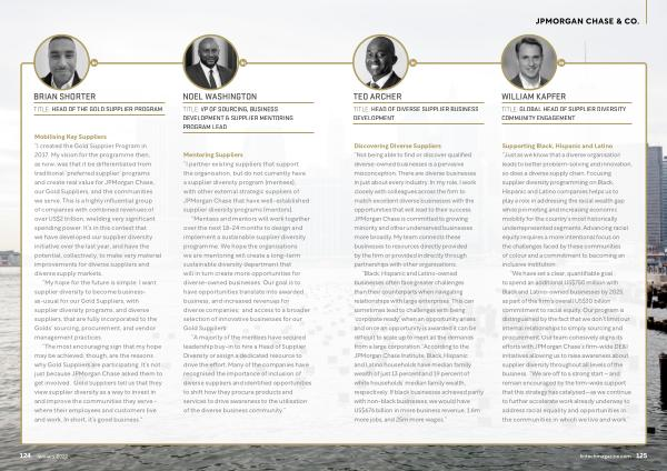 Mobilising Key Suppliers “ I created the Gold Supplier Program in 2017 . My vision for the programme then , as now , was that it be differentiated from traditional ‘ preferred supplier ’ programs and create real value for JPMorgan Chase , our Gold Suppliers , and the communities we serve . This is a highly influential group of companies with combined revenues of over US $ 2 trillion , wielding very significant spending power . It ’ s in this context that we have developed our supplier diversity initiative over the last year , and have the potential , collectively , to make very material improvements for diverse suppliers and diverse supply markets .