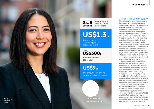 Acquisition strategy delivers growth Ripple has completed six acquisitions in just over two years, including two valued at over US $ 1bn. The transactions have expanded the company’ s footprint across payments, custody and stablecoins whilst entering new markets in prime brokerage and treasury management. In a recent statement at the company’ s Swell conference, Brad noted that Ripple would be slowing down its“ acquisition binge” in 2026.