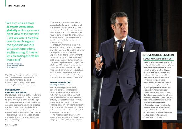 Pairing industry knowledge and capital DigitalBridge’ s origins as both operator and investor uniquely position the company to take advantage of shifts in technology and market behaviour. Its combination of scale and operational insight has enabled the firm to play a leading role in digital infrastructure’ s transition to the cloud, next-generation telecom and the rise of AI.