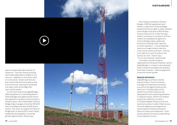 Beyond cell towers DigitalBridge’ s portfolio extends beyond towers. The firm actively manages and operates businesses across the full digital infrastructure spectrum, including data centre platforms and fibre networks. By applying the same operating discipline to adjacent assets, Steven has helped expand the definition of what is considered digital infrastructure and launched outdoor media infrastructure. This new adjacency emerged from observing the similarities between telecom towers and billboards – both passive physical structures, generating recurring lease income.