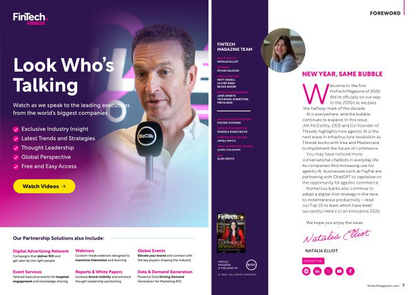 Welcome to the first FinTech Magazine of 2026. We’ re officially on our way to the 2030s as we pass the halfway mark of the decade. AI is everywhere, and the bubble continues to expand. In this issue, Jim McCarthy, CEO and Co-founder of Thredd, highlights how agentic AI is the next wave in infrastructure revolution as Thredd works with Visa and Mastercard to implement the future of commerce.