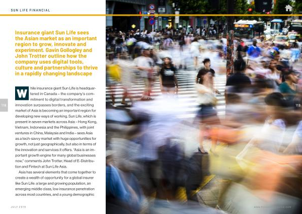 W hile insurance giant Sun Life is headquartered in Canada – the company ’ s commitment to digital transformation and innovation surpasses borders , and the exciting market of Asia is becoming an important region for developing new ways of working . Sun Life , which is present in seven markets across Asia – Hong Kong , Vietnam , Indonesia and the Philippines , with joint ventures in China , Malaysia and India – sees Asia as a tech-savvy market with huge opportunities for growth , not just geographically , but also in terms of the innovation and services it offers . “ Asia is an important growth engine for many global businesses now ,” comments John Trotter , Head of E-Distribution and Fintech at Sun Life Asia .