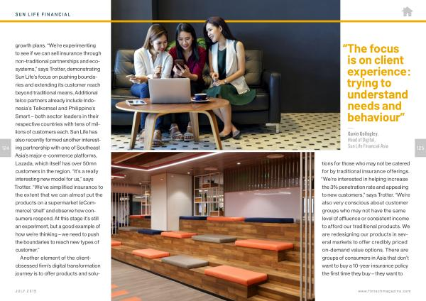 124 growth plans . “ We ’ re experimenting to see if we can sell insurance through non-traditional partnerships and ecosystems ,” says Trotter , demonstrating Sun Life ’ s focus on pushing boundaries and extending its customer reach beyond traditional means . Additional telco partners already include Indonesia ’ s Telkomsel and Philippine ’ s Smart – both sector leaders in their respective countries with tens of millions of customers each . Sun Life has also recently formed another interesting partnership with one of Southeast Asia ’ s major e-commerce platforms , Lazada , which itself has over 50mn customers in the region . “ It ’ s a really interesting new model for us ,” says Trotter . “ We ’ ve simplified insurance to the extent that we can almost put the products on a supermarket ( eCommerce ) ‘ shelf ’ and observe how consumers respond . At this stage it ’ s still an experiment , but a good example of how we ’ re thinking – we need to push the boundaries to reach new types of customer .”